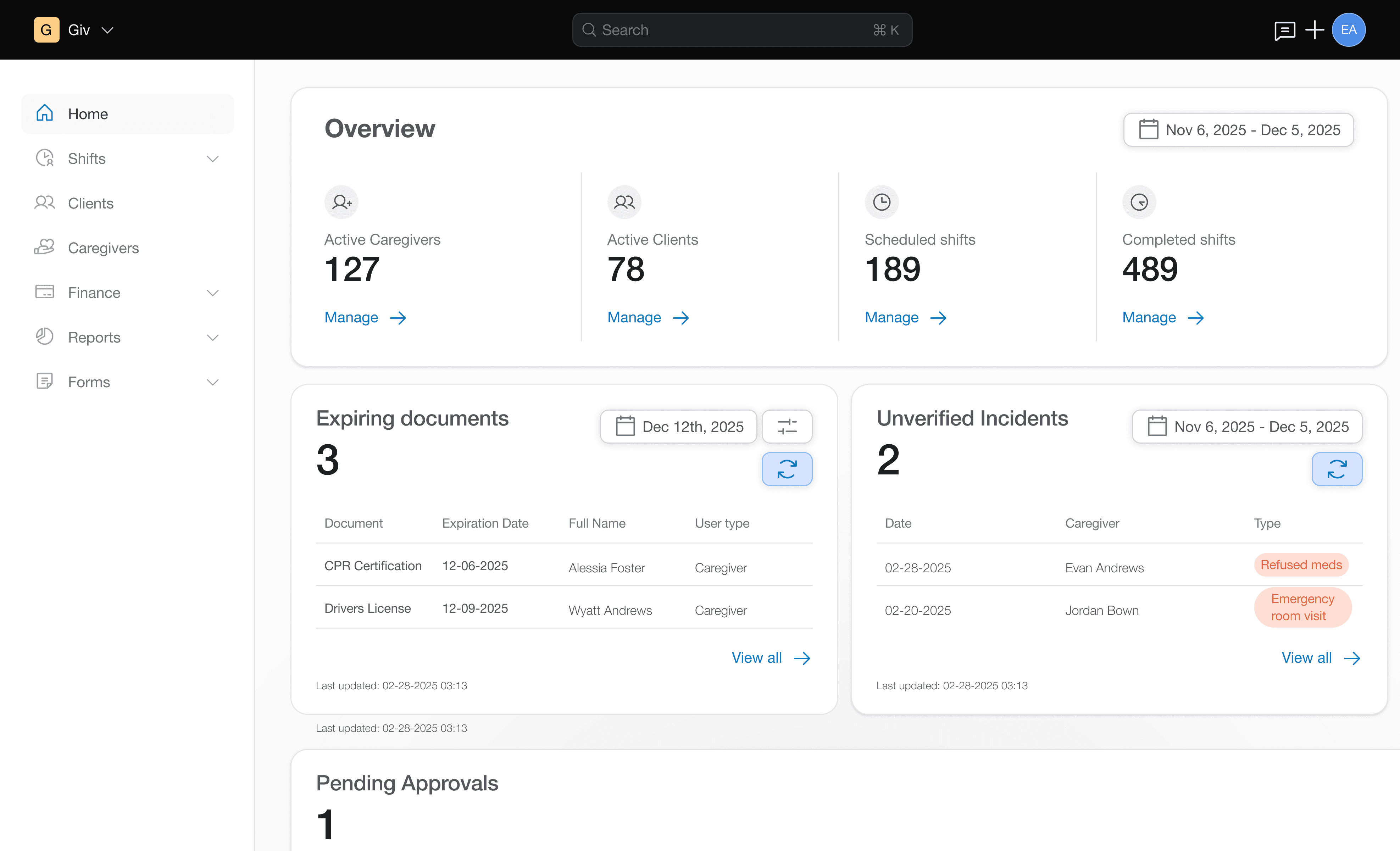 Giv shows completed services instantly and builds claims you can send individually or in batches.