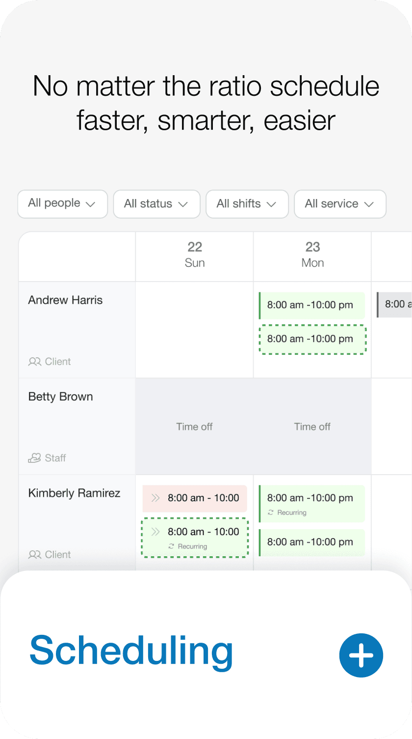 The Giv Scheduler makes staff coordination fast, clear, and stress-free. See real-time availability, assign shifts with confidence, and handle last-minute changes without the chaos. Built specifically for IDD agencies, Giv replaces clunky spreadsheets with HIPAA-compliant scheduling tools your whole team can trust.