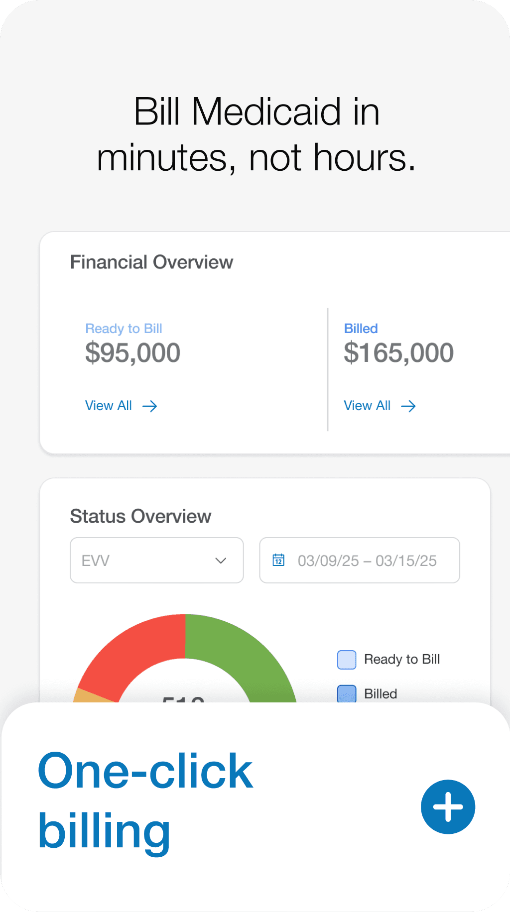 No more digging through records, and delayed revenue. Just billing that works with one click submissions.